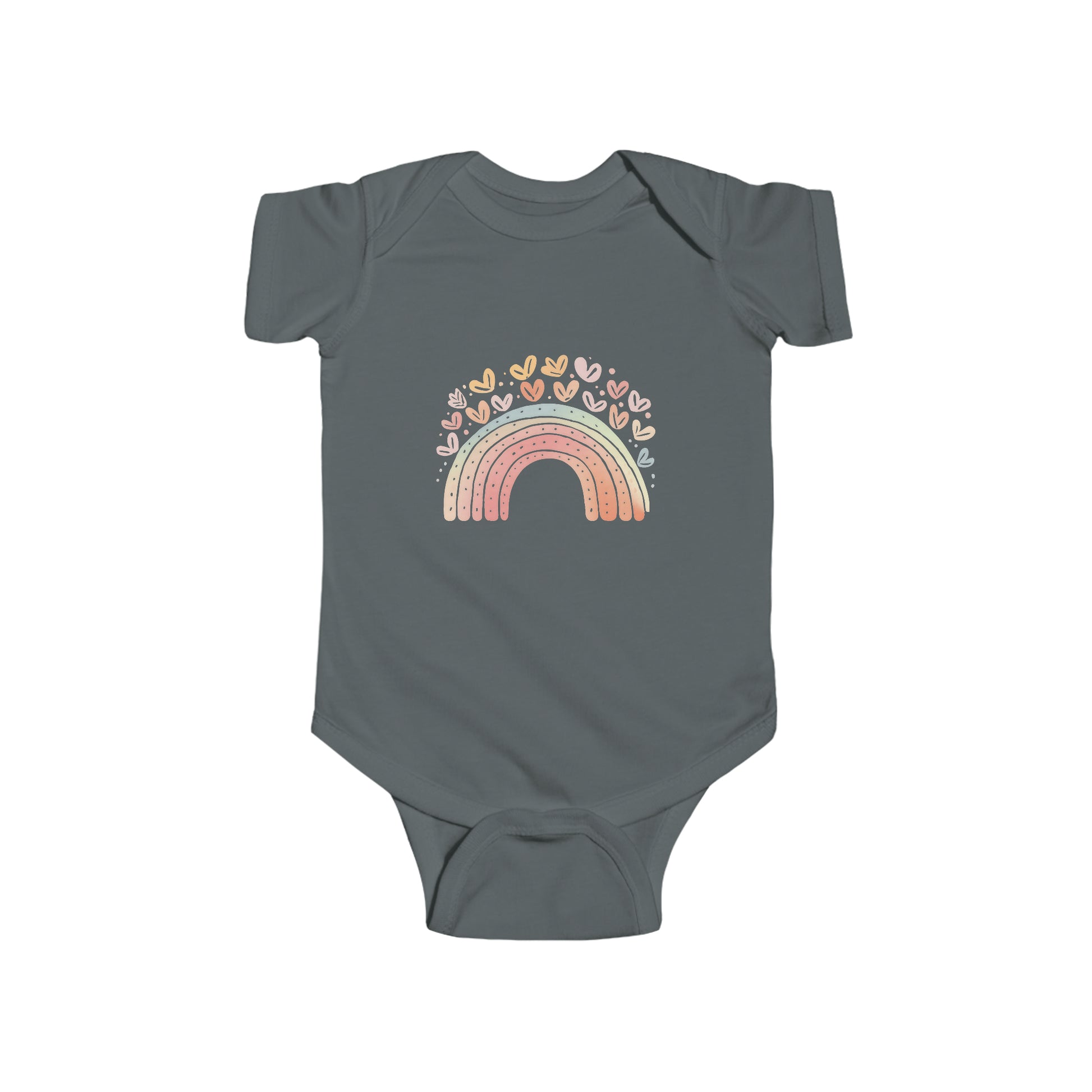 This onesie features a colorful rainbow design and adorable hearts, making it a fun and whimsical addition to your baby's wardrobe. Its soft fabric ensures comfort for your little one. Add some cheer to their day with this vibrant and cozy onesie.