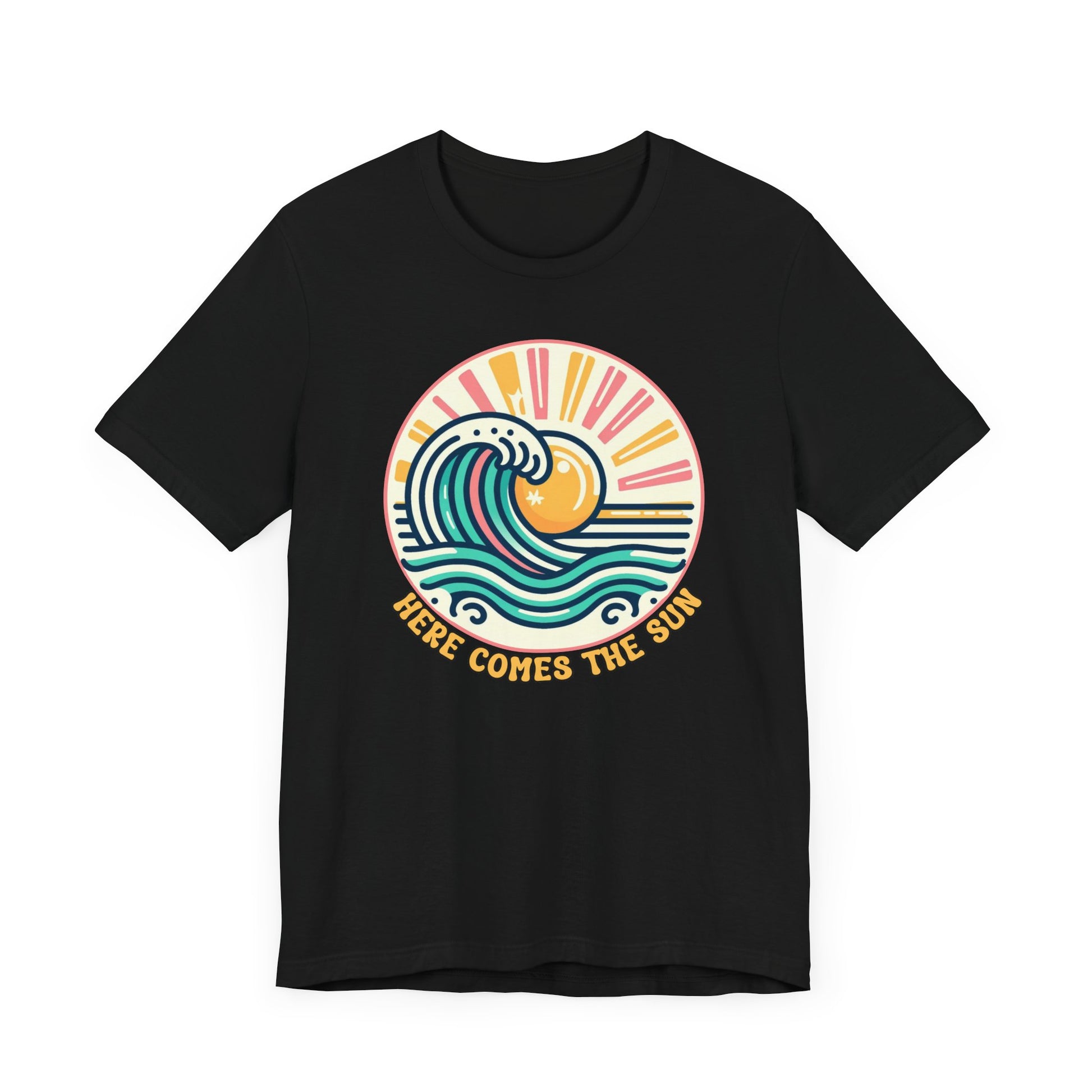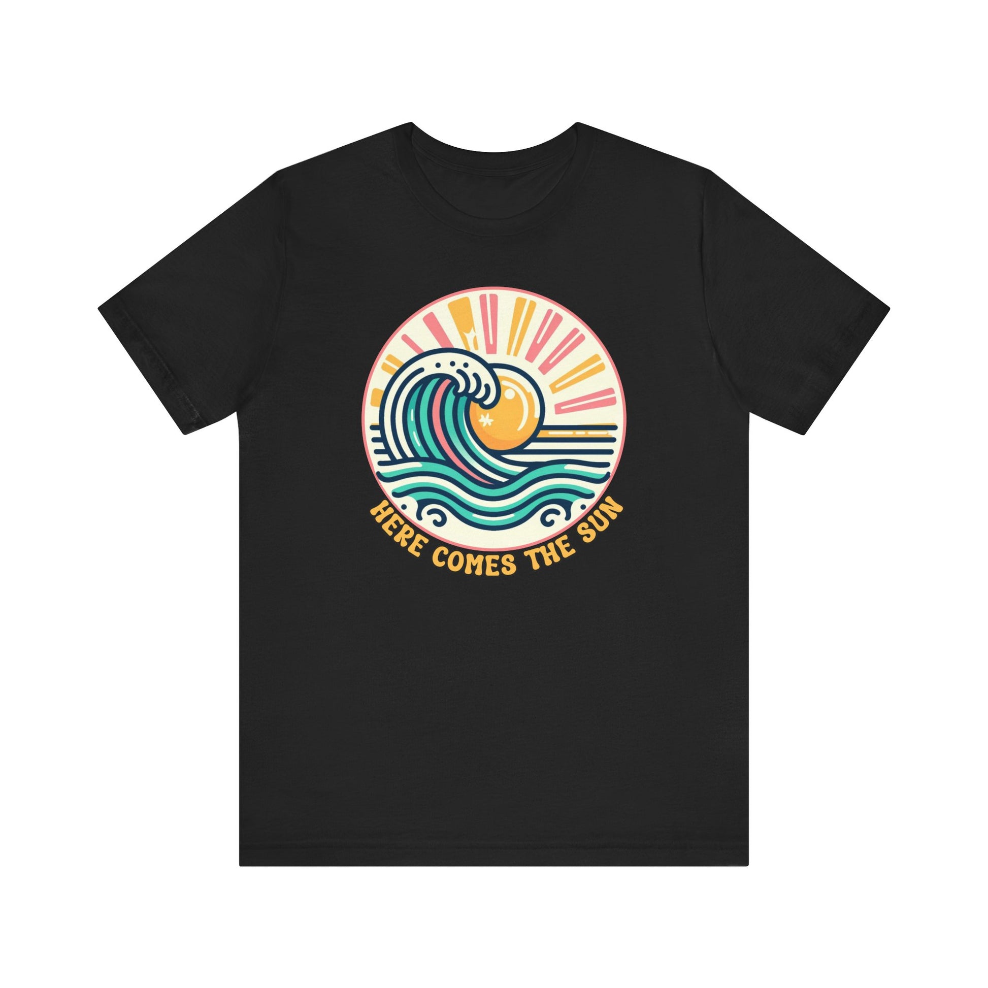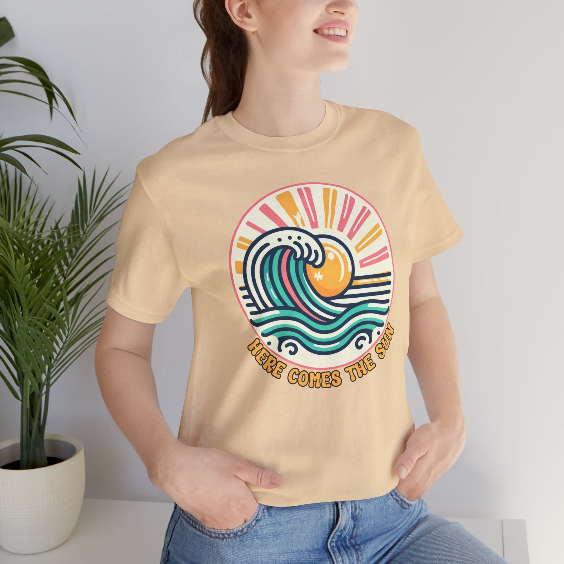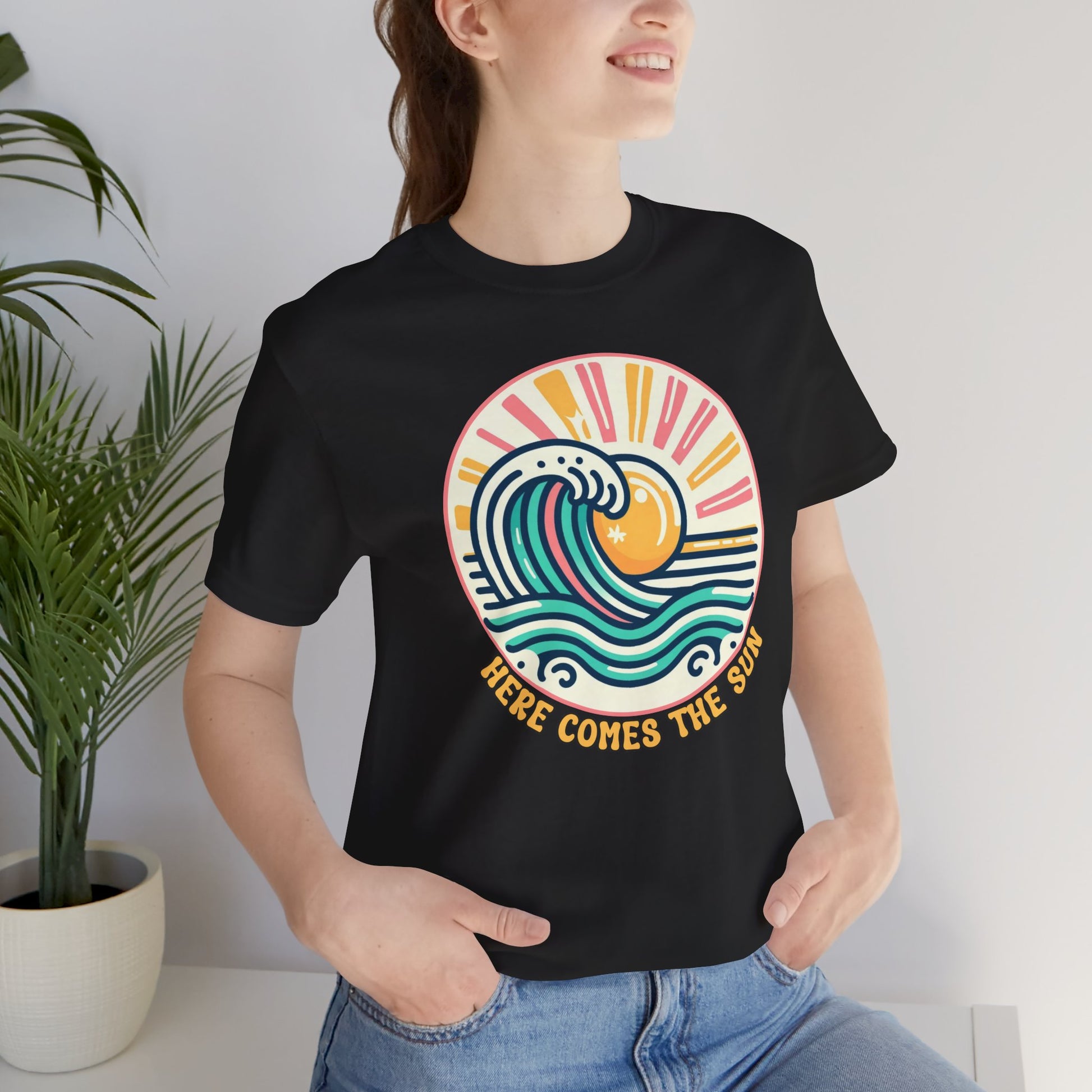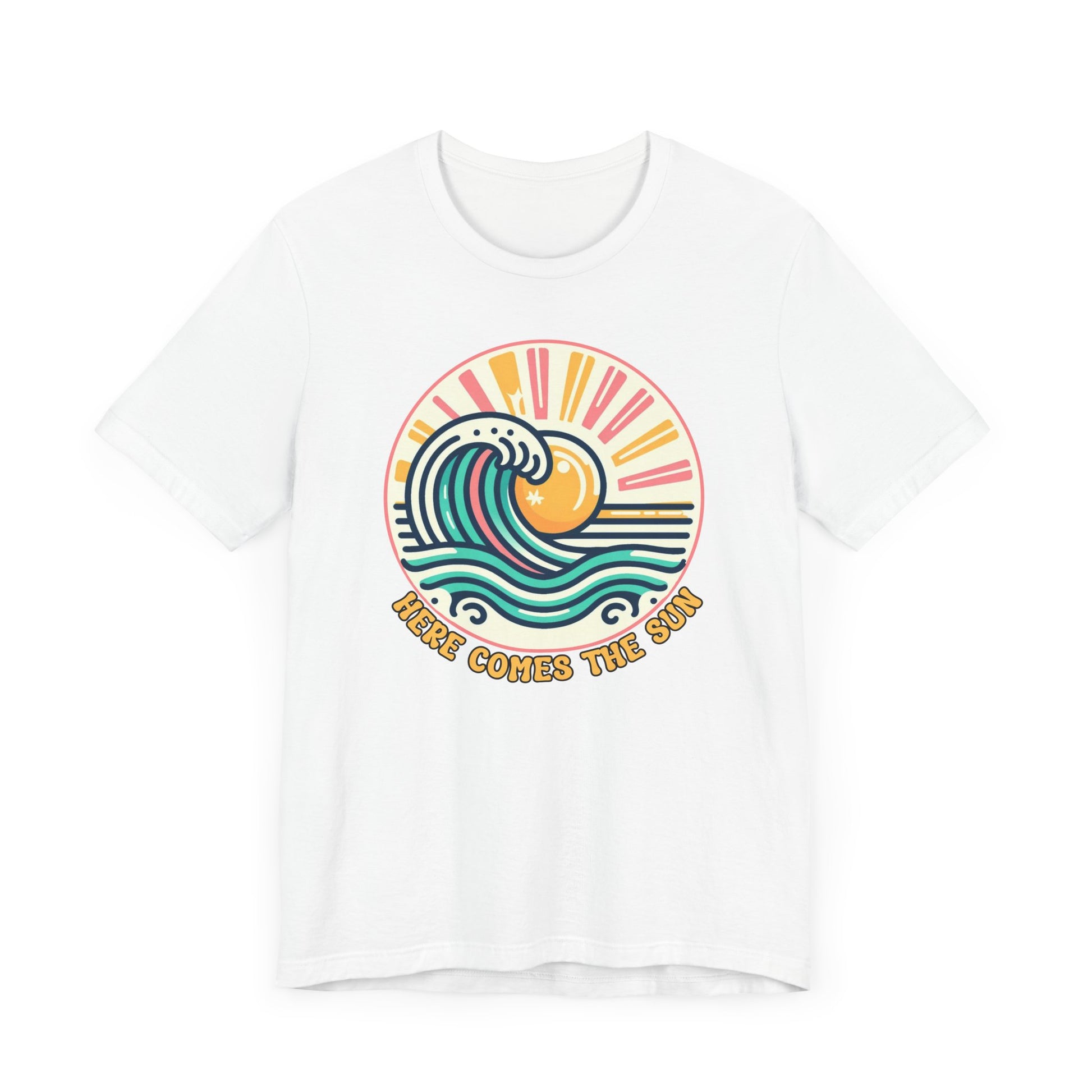 Embrace a laid-back vibe with this Here Comes The Sun tee, perfect for warm days and relaxed outings. The vibrant design featuring waves and a sun radiates positivity, making it an ideal addition to any casual wardrobe. Layer it with your favorite jacket for a cool evening look or wear it solo to celebrate sunny adventures. Its versatile style is suitable for beach outings, picnics, and leisurely strolls in the park, making it a go-to choice for summertime fun. This tee resonates with beach lovers and casual fashion enthusiasts alike, making it the perfect gift for birthdays, summer holidays, and beach parties. Whether you're enjoying a chill day at the beach or hanging out with friends, this tee adds cheerful energy to any occasion.